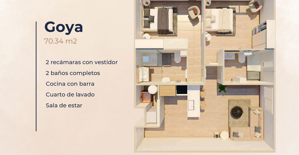 🖼️ Goya (70.34 m²): 2 recámaras con vestidor, 2 baños completos, cocina con barra, sala de estar y cuarto de lavado.