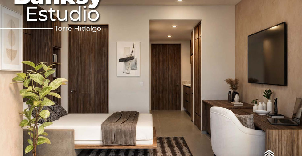 🎨 Banksy (35 m²): 1 recámara, 1 baño completo, cocina, sala, walking closet y cuarto de lavado.